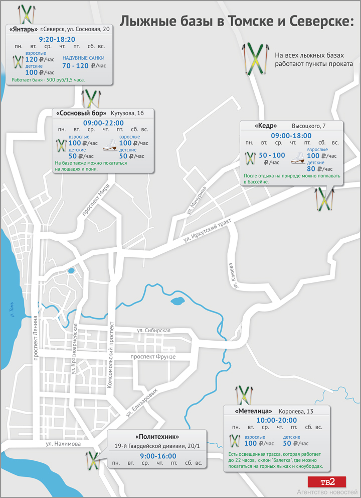 Агентство новостей ТВ2 подготовило карту спортивных комплексов и лыжных трасс.