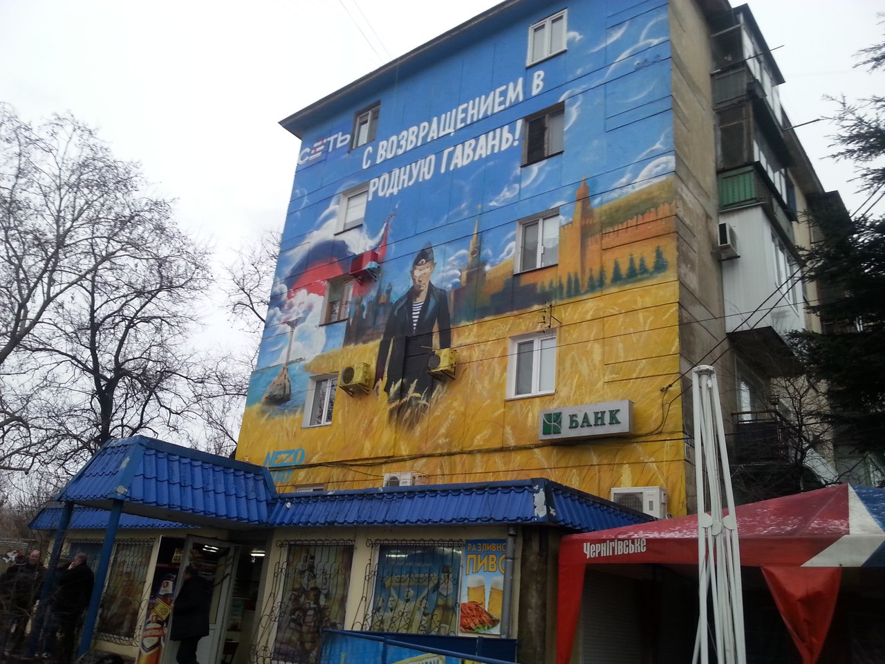 Надпись «С возвращением в родную гавань» с портретом Путина нарисовали московские художники после так называемого референдума.