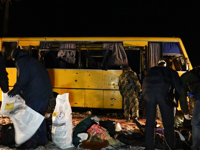 Наблюдатели ОБСЕ пришли к выводу, что автобус под Волновахой имеет осколочные повреждения от взорвавшегося в 12-15 метрах от него ракетного снаряда, передает Русская служба ВВС. Наблюдатели в докладе со ссылкой на региональную транспортную полицию заявляют, что возле автобуса взорвался снаряд ракеты "Град".
