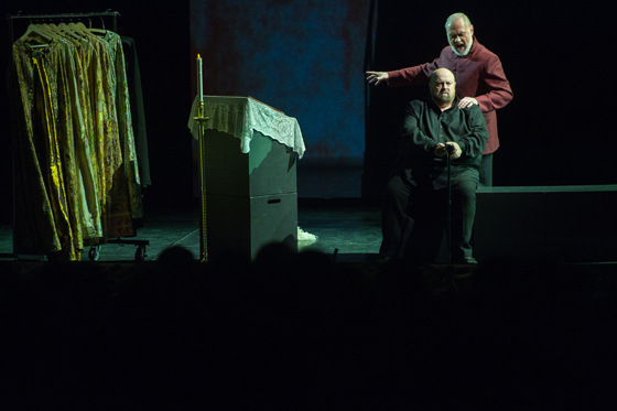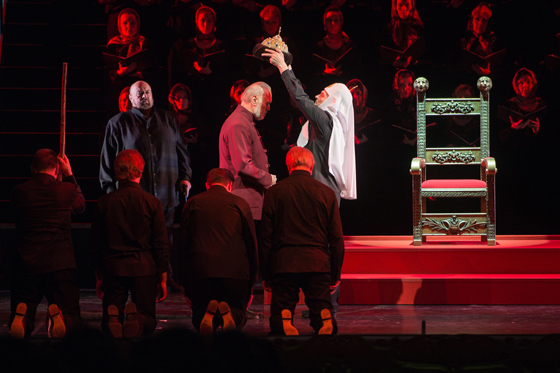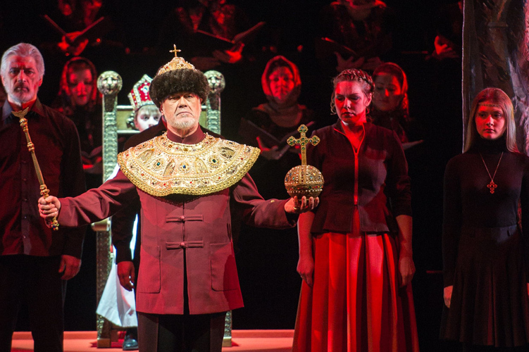 © Николай Круссер / Михайловский театр «Царь Борис» Такова предыстория проекта под названием «Царь Борис», состоявшегося в начале января в Михайловском театре. Мрачноватым лаконичным мизансценированием в духе 80-х годов прошлого века занимался Виталий Фиалковский, уже работавший на этой сцене с Юровским над «Мастером и Маргаритой» Слонимского. Драматическая актриса Елена Калинина предваряла каждую сцену чтением фрагмента из «Истории государства Российского» Карамзина. А главные события происходили в оркестре, тон в котором задавали музыканты знаменитого британского Orchestra of the Age of Enlightenment, перемешанные с музыкантами Михайловского театра и Санкт-Петербургской камераты. Довершал картину Сергей Лейферкус в заглавной партии, баритон вместо привычного баса. Юровский в комментариях к проекту настаивал, что именно этот певец, этот актер и этот тембр лучше всего соответствуют первой авторской редакции, в которой и тесситура чуть выше, и забронзовелости не требуется.