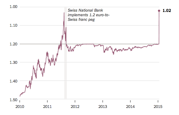 Швейцарский национальный банк 15 января отказался от введенного в 2011 году «потолка» в 1,2 швейцарских франка за евро. В тот же день национальная валюта подскочила на 39%, а евро, наоборот, опустился до 11-летнего минимума. Такие резкие скачки с самыми надежными валютами случаются раз в десятилетие или даже реже. Старший экономический обозреватель The New York Times Нил Ирвин объясняет, зачем Швейцария отменила потолок и всполошила весь мировой валютный рынок.