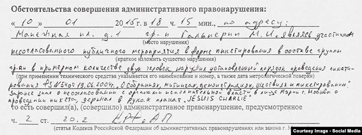 Ранее в пятницу стало известно, что Тверской районный суд Москвы приговорил Марка Гальперина к 8 суткам ареста – за одиночный пикет на Манежной площади с плакатом "Я – Шарли" 10 января. По данным сайта "ОВД-Инфо", Гальперина арестовали по статье о "проведении мероприятия без согласования".