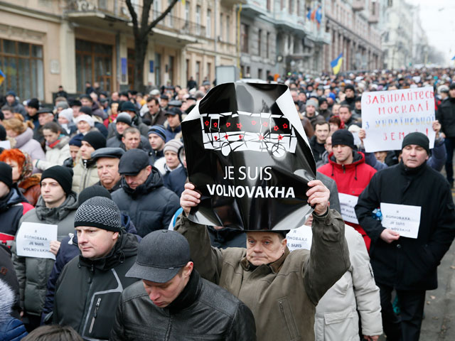 В Киеве, как передает "Интерфакс", шествие началось около полудня: многотысячная колонна двинулась от парка им. Тараса Шевченко в сторону Майдана. Люди держали в руках государственные флаги Украины, а также плакаты с надписью "Я Волноваха" в память о погибших пассажирах маршрутного автобуса. Во главе колонны шли представители духовенства, а также общественные и политические деятели.
