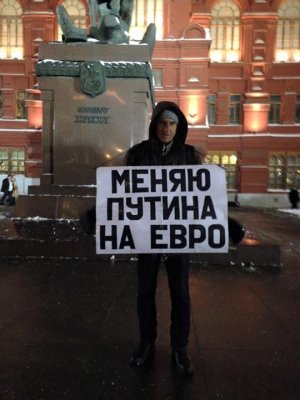 В субботу, 10 января, нас пришло человек пятнадцать. Пикет одиночный, а все люди пришли неравнодушные, не мертвые души, у каждого по несколько плакатов. У меня их было семь штук, но стоял я тогда с «Шарли». Желающих было много, и мы стояли по очереди у Жукова, буквально по две, по три минуты. Я только встал, успел поднять руки — и ко мне подошли [полицейские]. Потом, правда, мне рассказали, ко мне подошел верноподданный, титушка какой-то, и меня поэтому забрали. Марк Гальперин начал за меня заступаться, и его тоже забрали. Вот мы вдвоем и уехали.
