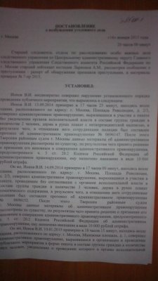 16 января на 75-летнего москвича Владимира Ионова завели первое в России уголовное дело за «неоднократные» (то есть более трех за полгода) нарушения на публичных мероприятиях. За несколько часов до этого Ионова в наручниках привезли в Тверской районный суд, где судья Иванов приговорил пенсионера к штрафу в 20 тысяч рублей за участие в несогласованной акции 10 января — тогда Ионов был задержан во время одиночного пикета с плакатом «Je suis Charlie». Следом был вынесен еще один обвинительный приговор, на этот раз за участие в акции, состоявшейся накануне, 15 января, на Манежной площади, и еще один штраф — 150 тысяч рублей за «повторное» нарушение.