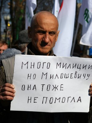 Это было давно, много лет назад, когда еще вместе выходили Лимонов, Касьянов, Каспаров, Рыжков. Однажды назначили сбор на Пушкинской. Я вышел из метро и вижу — все есть. Хочу к ним пройти, а все огорожено, все в милиции — милиция, милиция, милиция. Я попасть не могу. Обошел вокруг, сначала по Тверскому бульвару, потом — через «Макдональдс». Иду, а мне навстречу женщина с вот такими глазами: «Не ходите, там избивают людей!». Но я все-таки дошел, мне страшно, но я дошел. Смотрю — а там уже не мои сторонники, а нашисты собрались. Ну, там мне делать нечего, я повернул обратно. Я так разозлился, меня всего колотило: «Как же так, что же это за издевательство над людьми!» Наверху, на Пушкинской, есть канцтовары. Я пошел, купил лист ватмана, маркер, сложил его в четыре раза — маленький получился, четвертушка — и написал: «Много милиции, но Милошевичу она не помогла». Тогда с Милошевичем все возились. Мне сказали, что на Тургеневской наши собираются, и я с этим плакатом пришел на Тургеневскую. Выхожу из метро, а там такой приступочек, а внизу стоит цепь омоновцев. Я встал, держу этот лист. Ну, две-три минуты я простоял, эти, кто может читать, — читали, кто не может — смотрели. Появился офицер и на меня показывает пальцем: «Этого — взять». И меня, естественно, взяли, посадили в автобус. Только меня посадили в автобус, тут началась бойня — разгон, избиения, крики. Мы просидели в автозаке это время, а потом нам сказали: «Идите вон». И все, мы пошли. Потому что мы никто. Вот с этого и началось.