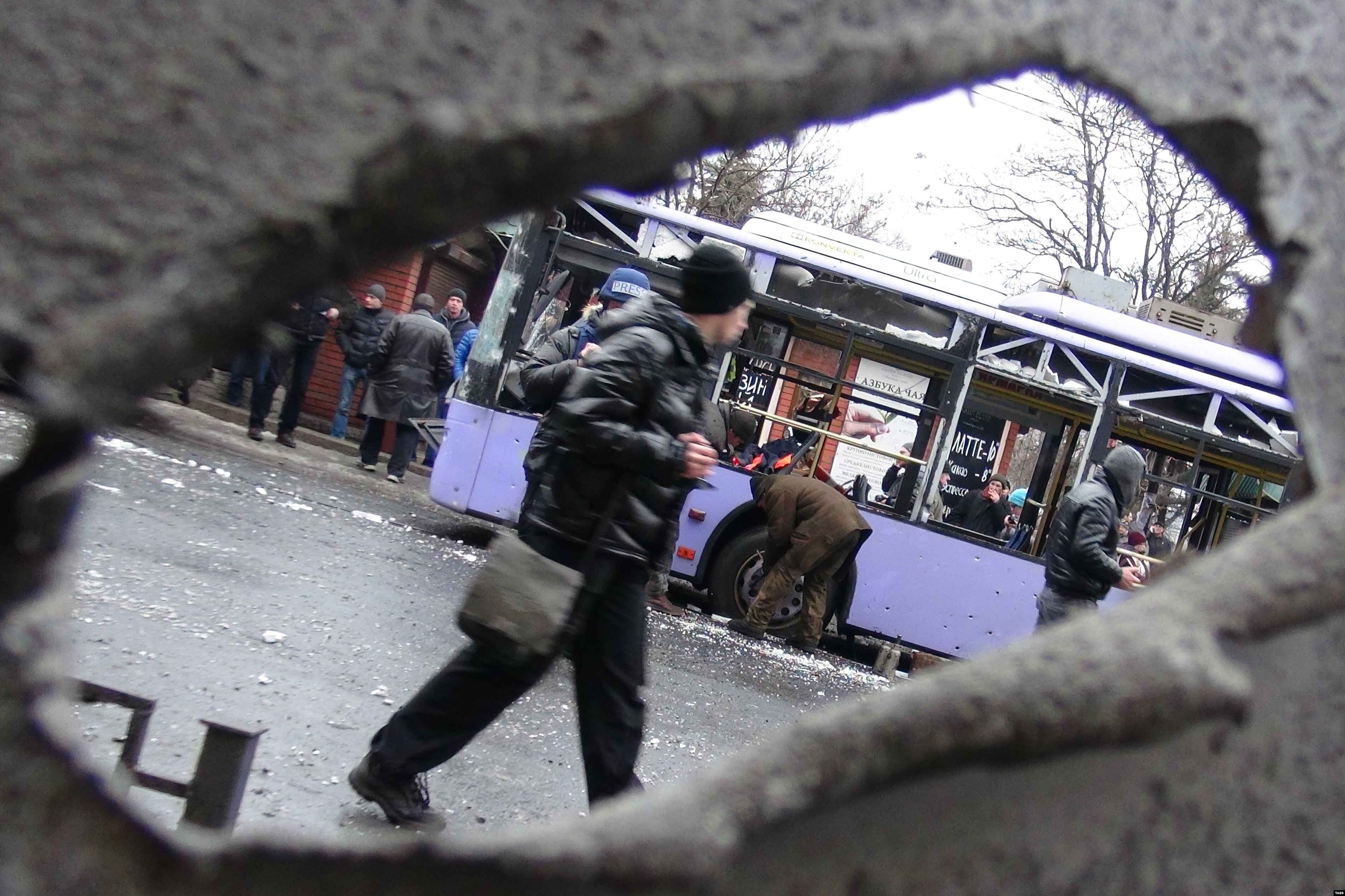 В Донецке в четверг снаряд попал в остановку, от которой отъезжал троллейбус. По разным данным, погибли от 8 до 13 человек, более 20 ранены.