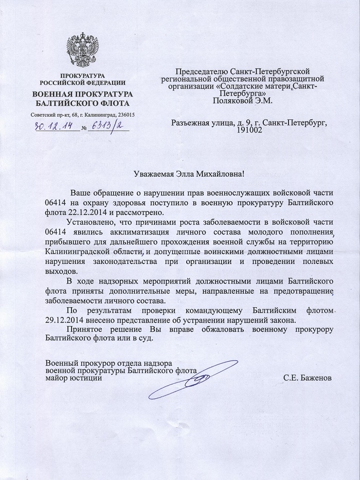 Однако военный прокурор отдела надзора военной прокуратуры Балтийского флота майор юстиции С. Баженов проверкой установил не только рост заболеваемости личного состава военной части №06414, но и потребовал от командующего Балтийского флота устранить нарушения закона, тем самым подтвердив информацию "Солдатских матерей Санкт-Петербурга".