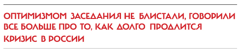 В кулуарах форума россияне обсуждали две темы: что будет делать правительство и насколько хватит российской власти денег. Первое пока в тумане, что касается второго, то большинство сходились на том, что резервов на 1,5-2 года хватит. Однако профессор Рогофф предлагает более сумрачный прогноз: резервы ЦБ — если Банк России будет тратить их так, как в декабре 2014-го, — истощатся уже к сентябрю. Игорь Шувалов подобный прогноз отметает: только резервы правительства насчитывают 8 трлн руб, ну а то, что часть из них уже обещаны (государственному ВТБ уже выдали гарантии на 500 млрд руб., а вообще на докапитализацию банковской системы уйдет 1 трлн руб.) — так эти обещания могут быть и отменены.