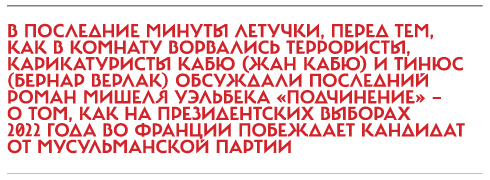 «Мы редко их (журналистов Charlie) видим, разве что у кофейных автоматов», — подтверждает Люк из Libération, работающий в соседней комнате. Из комнаты Charlie не слышны даже голоса — следующий выпуск еженедельника решено отложить из-за небывалой популярности прошлого номера, поэтому в редакции куда меньше людей, чем обычно. При этом в воздухе витает ощущение удручающей тишины: напротив входа в помещение Charlie Hebdo висит газетная вырезка — рассказ Филиппа Лансона, одного из хроникеров издания, написанный им в тяжелом состоянии в больнице вскоре после расстрела редакции. В частности, Лансон описывает последние минуты летучки перед тем, как в комнату ворвались террористы: карикатуристы Кабю (Жан Кабю) и Тинюс (Бернар Верлак) обсуждали последний роман Мишеля Уэльбека «Подчинение» — о том, как на президентских выборах 2022 года во Франции побеждает кандидат от мусульманской партии. Роман, кстати говоря, наделал много шума, а сам Уэльбек, карикатура на которого была на обложке предпоследнего номера Charlie Hebdo, не без вызова заявлял, что не боится никаких атак. Но это было до 7 января.