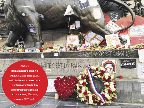 Неизвестно также, вернутся ли журналисты Charlie Hebdo когда-нибудь в свое старое здание, которое находится в 10 минутах ходьбы от Libération по бульвару Вольтера. Весь путь туда сопровождают плакаты и наклейки Je suis Charlie, а на одном из перекрестков сложно не заметить портрет самого философа с подписью «Вольтер тоже Шарли». Не доходя до места трагедии, прямо на бульваре, горкой сложены цветы — сверху лежат свежие букеты — рядом фотографии убитых карикатуристов, письма читателей, юмористические коллажи. Проходящие мимо останавливаются, стоят пару минут молча и идут дальше — как будто совершают какой-то ритуал. Невозможно не заметить и припаркованную рядом машину жандармерии. Рослый мужчина в форме внимательно смотрит в сторону забора с цветами. Скоро становится понятно, почему букеты складывают на бульваре: само здание редакции Charlie Hebdo все еще оцеплено, а по всему периметру стоят автоматчики. Один из них резко поднимает руку с предупреждающим жестом — к оцеплениям нельзя даже подходить.