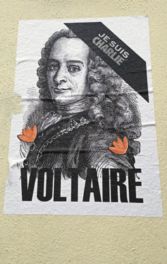 | На бульваре Вольтера расклеены портреты философа с надписью: «Вольтер тоже Шарли», Париж, январь 2015 года |