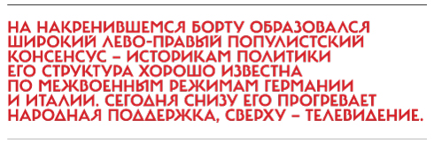 Иконы уже давно стали частью политической атрибутики, Москва, 11 ноября 2014 годаПопулистский синтез На накренившемся борту образовался широкий лево-правый популистский консенсус. Историкам политики его структура хорошо известна по межвоенным режимам Германии и Италии. В традициях левой политической мысли его принято квалифицировать как реакционный и консервативный. Фашизм — это политика крайне реакционной крупной буржуазии.
