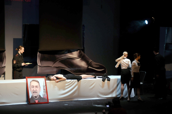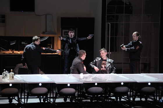 © Павел Шрамковский Режиссер Петр Шерешевский хорошо понимает, что важнейшим из приемов трагедии для нас сегодня является трагический абсурд. Отравленные сальерианским ядом, истории Моцарта на глазах мутируют в пугающую бессмыслицу. Барон (Николай Ротов) и Альбер выясняют отношения на телешоу «В гостях у Герцога» («Ужасный век, ужасные сердца, встретимся через неделю»), а видеосюжеты о жизни каждого из них — наспех слепленные поделки. Влиятельный Командор (очень тонкая работа актера Андрея Демышева), явившись на квартиру своей вдовы и застав ее в постели с Дон Гуаном, лишь ухмыльнется и велит жене подать борща. А мятежному перформансисту Гуану ответит не каменной десницей, а чтением стихов Иосифа Бродского, безупречного каталогизатора «усталой культуры». Побежденный рокер Гуан сделает то, что свойственно многим отечественным рокерам: съест свой дармовой борщ, вылижет хозяйскую тарелку и на цыпочках просочится за кулисы.