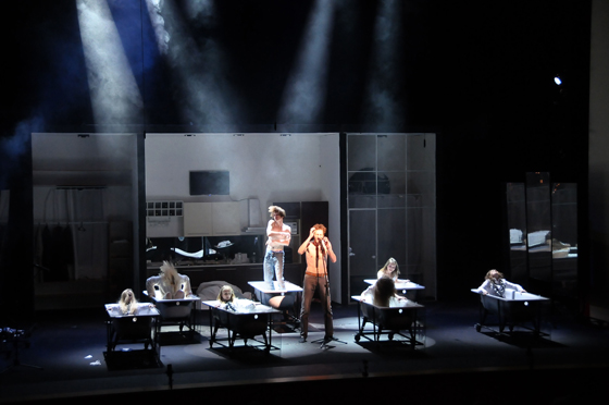То, что мы увидим дальше, — «Дон Гуан» и «Скупой рыцарь» — в композиции спектакля суть сочинения Моцарта, которые он, чуть стесняясь, показывает Сальери. Художник спектакля Елена Сорочайкина создала эффектную декорацию-трансформер, легко переносящую действие из квартиры на вокзал (сцены на вокзале — явный поклон «Лесу» Кирилла Серебренникова), площадь, в телевизионную студию и ресторан. Тут есть даже статуя Командора, чьи циклопические ботинки опускаются из-под колосников под депешмодовское «Try Walking in My Shoes». Зачин обеих моцартовских историй бесшабашен: жестокие проказы рокера Дон Гуана (ирония, драйв и психологическая подвижность актера Михаила Солодянкина великолепно вписались в предложенный режиссером образ), горькая бедняцкая доля байкера Альбера (Иван Овчинников), лишившегося последнего мотоциклетного шлема. Веселый трэш-хеппенинг ломается пополам в начале второго действия. Подкинув яда в бокал Моцарта, Сальери как будто набивается в соавторы — и увлекательные анекдоты оборачиваются трагедиями.