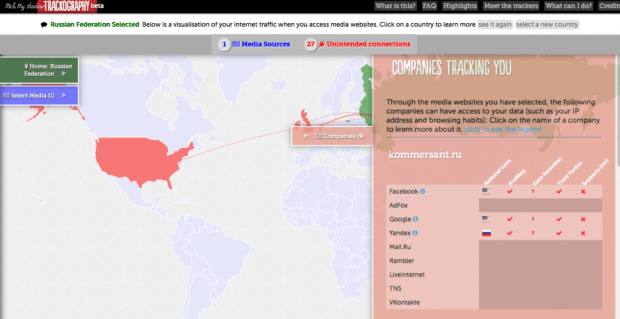 Вы когда-нибудь задумывались о том, кто за вами следит в то время, пока вы читаете свой любимый новостной сайт в Интернете? Инструмент Trackography, созданный организацией Tactical Tech, наглядно показывает, какие компании отслеживают ваши данные и через какие страны проходит трафик.