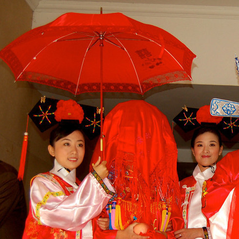 По китайской свадебной традиции, вся процессия сопровождает невесту на роскошных свадебных сидениях. Красный цвет является основным для китайских свадеб, символизируя смелость, удачу и любовь. Также, невеста носит красный платок, скрывающий её лицо, а кто-то из помощников несёт над её головой красный зонт, который, по верованиям, благоприятен для рождаемости в её будущей семье.