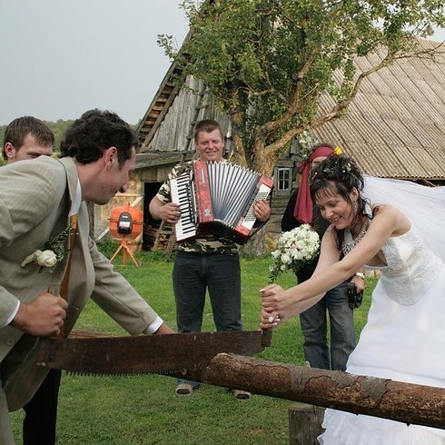 В Германии молодожёны должны пройти тест на совместный труд, перепиливая бревно. Это действо призвано продемонстрировать способность невесты и жениха к совместному преодолению препятствий, которые могут возникнуть во время брака.
