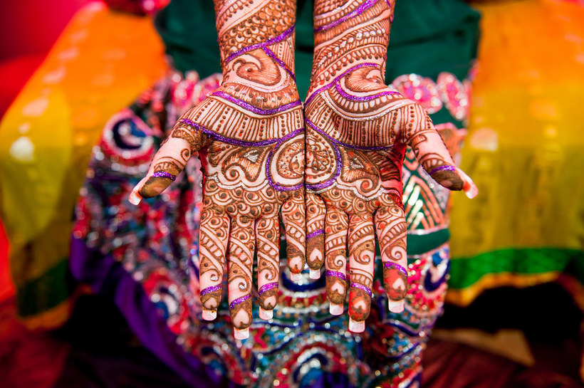 Сложная визуальная часть традиционной индийской свадьбы - раскрашивание невесты и других женщин, участвующих в свадьбе, замысловатыми узорами хной, символизирующими радость, надежду и любовь.