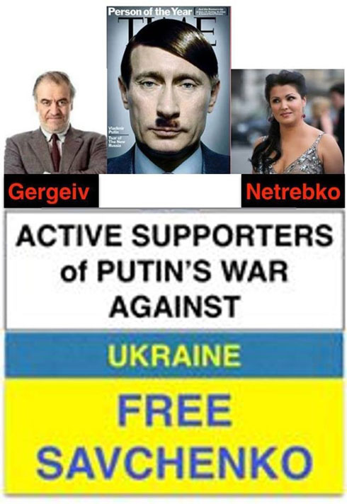 Перевоплотившийся в образ Олега Царева активист демонстрирует прохожим чек на 1 миллион рублей от Анны Нетребко на восстановление пострадавшей репутации Metropolitan Opera 29 января в Нью-Йорке активисты из группы «Arts Against Aggression» устроили акцию протеста во время премьеры «Иоланты» Чайковского в театре Metropolitan Opera. За дирижерским пультом в этот день стоял Валерий Гергиев, главную партию исполняла Анна Нетребко. Зарубежные поездки Гергиева и Нетребко, поддержавших в прошлом году политику Владимира Путина по отношению к Украине, уже не в первый раз сопровождаются протестами гражданских активистов. В США акции проходили возле Бруклинской Академии Музыки (БАМ), Карнеги-Холла, в Йельском и Мичиганском Университетах.