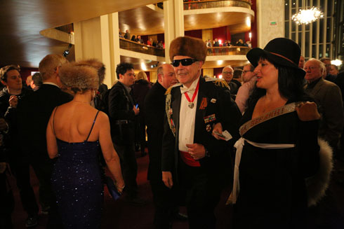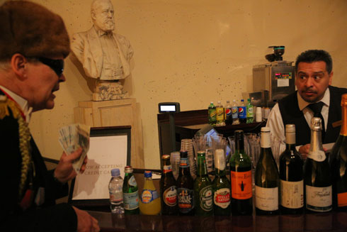 Активист в образе Олега Царева пытается купить пиво в буфете Metropolitan Opera за российские рубли
