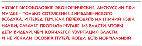 Потому что любые высоколобые экономические дискуссии при Мугабе (и его тотальном контроле за всем, что шевелится и угрожает его окаменелой монополии), — только сотрясение зимбабвийского воздуха. И перед тем, как переходить на птичий язык науки, следует прогнать Мугабе из власти — желательно поганой метлой и ссаными тряпками, в назидание юношеству. Чтобы дети видели, чем кончается узурпация власти, и не искали особых путей, когда есть нормальный.