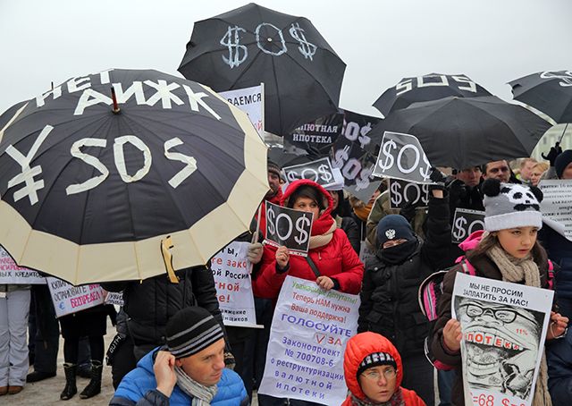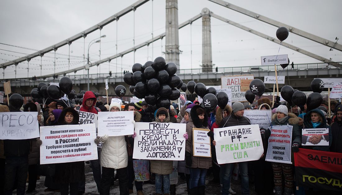 Вторая половина декабря 2014 года, всего несколько дней назад курс рубля по отношению к доллару опустился до рекордно низких значений. Дороже доллар в России стоил только до деноминации 1998 года. У входа в столичный Парк им. Горького — на пустой площадке, которую столичные власти все пытаются превратить в «Гайд-парк» — собираются примерно две тысячи человек. Это люди, взявшие в середине нулевых ипотеку в долларах. С обвалом рубля осенью 2014-го их ежемесячный платеж, как правило, стал превышать ежемесячный доход. «Центробанк выдал лицензию на грабеж. Отвечай перед заемщиками!» — написано на их плакатах. Или же: «Мы не просим отнимать деньги у банка и государства. Мы требуем не отнимать наши!»