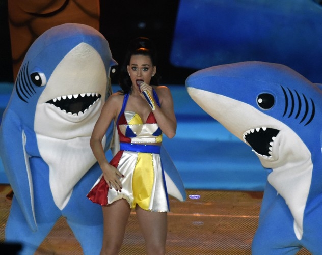 Кажется, публика ждала чего-то подобного и на этот раз – от Кэти Перри, назначенной звездой нынешнего Супербоула. Увы, сама певица повода не дала, но интернет прицепился к двум акулам – ростовым фигурам на подтанцовке.