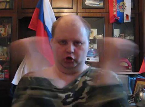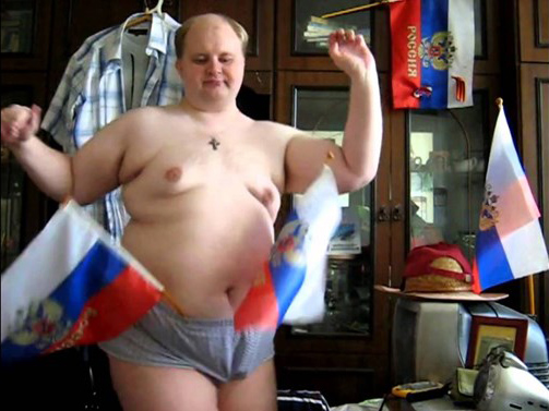 © Supernova / Cinefantom Теперь от содержания речей перейдем к тому, кто их произносит. Во внешности и поведении оратора с пародийной наглядностью представлены практически все составляющие идентичности «путинского большинства»: накрашенные фиолетовым губы (карнавальная поп-культура), натянутый на нос крест (своеобразно понятое православие), вечная тарелка с едой неподалеку (простейший консюмеризм), камуфляжная майка и георгиевская ленточка (милитаристский патриотизм), танцы в просторных развевающихся трусах (грубоватый посттоталитарный эротизм общества, где всего четверть века назад «секса не было») на фоне натянутого на стене государственного флага. «Ура, ура, ура! Браво, браво, браво! Успех, успех, успех — русским, россиянам, русским, россиянам!»