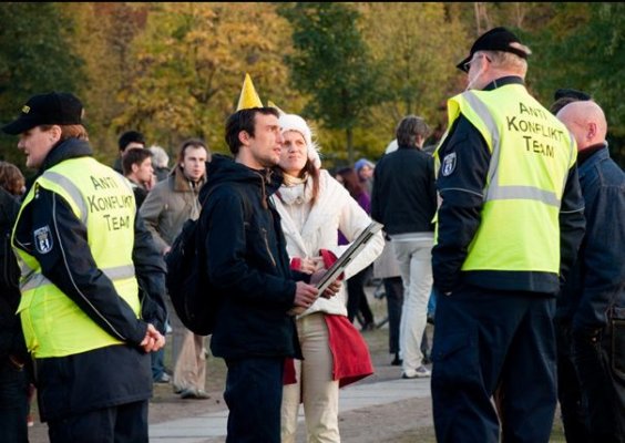 Например, если это длинная демонстрация, иногда люди в конце идут очень медленно, а в начале — быстро, и шествие начинает растягиваться и разрываться. Тогда мы его останавливаем, чтобы они смогли снова собраться вместе. Или же если в одной части начинаются беспорядки или появляются люди в масках, скрывающие свою личность, мы останавливаем демонстрацию и говорим, что движение продолжится, как только все снимут маски. Множество причин. Бывает, что организатор вдруг объявляет: «Все, я пошел домой». Они проложили длинный маршрут через весь Берлин, а потом на полпути говорят: «Все, я ухожу». В таком случае нам нужно найти кого-то еще, кто будет отвечать за демонстрацию. Бывают самые разные причины. И Twitter тут очень помогает. Конечно, у нас есть громкоговорители, но их хорошо слышно только вблизи, и потом они всегда звучат очень недружелюбно. А вот если ты пишешь в твиттер, в благожелательном ключе, мне кажется, это действительно помогает, это дополнительный инструмент коммуникации. А коммуникация, пока есть еще такая возможность, остается для нас самым главным.