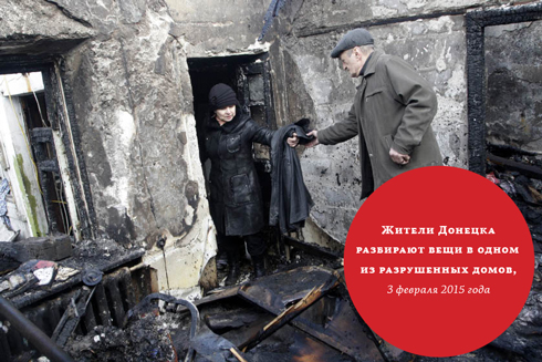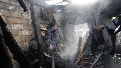 Пожарный вместе с жительницей Донецка осматривают разрушенный дом, 3 февраля 2015 год
