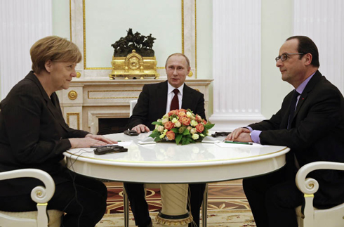 Встреча Ангелы Меркель, Франсуа Олланда и Владимира Путина, Москва, 6 февраля 2015 года На самом деле, все немного иначе. Меркель и Олланд подготовили свой план, ознакомившись с переданными им в конце января предложениями Путина. Отсюда и выраженная Кремлем перед их визитом надежда, что эти предложения учтены. Кто-то, выведывая подробности плана, тут же провел аналогию с урегулированием в Боснии (Дейтонские соглашения) — а стало быть, Европа из желания немедленно заморозить конфликт согласилась с федерализацией Украины. Кто-то вспомнил об Абхазии, где ключевую роль сыграли коллективные силы по поддержанию мира, правда, полностью укомплектованные российскими миротворцами, на что Украина в нынешней ситуации не согласится никогда.