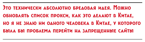 То же самое произойдет, если нам запретят использовать IP-адрес, который не указывает на наши паспортные данные. Где вообще IP-адрес, который указывает на наши паспортные данные? Прокси-сервер, то есть сервер-посредник для обмена информацией между компьютерами, можно настроить на любом компьютере в мировой сети интернет. Более того, прокси можно настроить, арендовав у любого провайдера дисковое пространство. Например, в Америке. И уже через него выходить на любые сайты, запрещенные в России. Так что же запрещать? Запрещать арендовать дисковое пространство? Запрещать одному компьютеру подключаться к другому? Это технически абсолютно бредовая идея. Можно обновлять список прокси, как это делают в Китае, но я не знаю ни одного человека в Китае, у которого была бы проблема перейти на запрещенные сайты.