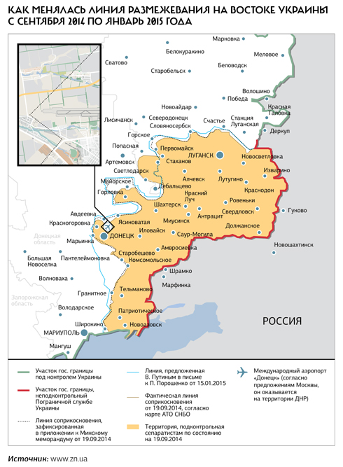 Киев, однако, никак не могла устроить ни та, ни другая дата. Первая — потому что в секретном приложении к Минском меморандуму от 19 сентября говорилось о другой линии разграничения — ее координаты проходили восточней. (А так получается, что и Донецкий аэропорт находится на территории, которая должна отойти к ДНР и ЛНР). Вторая — потому что к 13 января 2015 года сепаратисты совокупно продвинулись уже на 600–650 км2 на Запад. Получалось, что Путин предлагает предать забвению «минскую линию» и легитимизировать «фактическую», январскую.