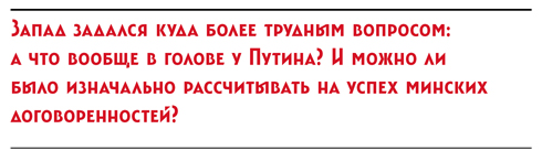 Но не прошло и месяца, как установившееся на Востоке Украины перемирие было сорвано, война вошла в новую фазу, а российские «гуманитарные конвои» и прочие «отпускники» как ходили так и продолжали ходить через нагую российско-украинскую границу. Запад задался куда более трудным вопросом: а что вообще в голове у Путина? И можно ли было изначально рассчитывать на успех минских договоренностей?