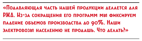 Председатель заводского профкома Алексей Милосердный рассказал, что полностью встал электровозосборочный цех, частично — штамповочный, работают только те цеха, у которых остались текущие заказы — «дорабатывают металл». «Подавляющая часть нашей продукции делается для РЖД. Из-за сокращения его программ мы фиксируем падение объемов производства до 90 %. Наши электровозы населению не продашь. Что делать?» — риторически спрашивает председатель профкома.