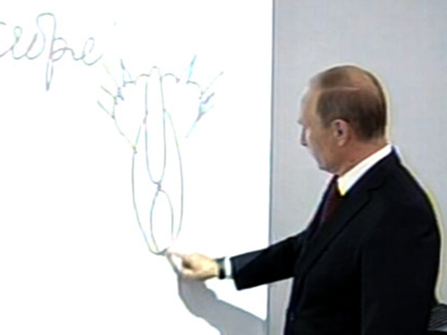 Тогда, напомним, Владимир Путин провел день знаний в Кургане, посетив отремонтированную и модернизированную по его указанию за 180 миллионов рублей школу N7. В классе программирования президенту показали современную доску, которая "ребятам особенно нравится, поскольку на (ней) можно рисовать пальцами, как на планшетниках", рассказывали учителя. Президент, как оказалось, тоже был не против порисовать пальцем и, не дослушав, стал выводить на доске фигуры, прокомментировав: "Это вам на память". Дети, правда, не поняли, что именно изобразил президент, и один из них спросил уже уходящего президента: "Что это?" На что Владимир Путин, стоя в дверях, поведал: "Кошка, вид сзади".