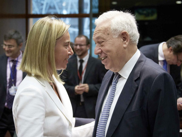 Федерика Могерини и Хосе Мануэль Гарсия-Маргальо. Фото: consilium.europa.eu Комментарий редактора: Германия и Франция также заявляли о готовности к вводу нового пакета санкций против России в случае дальнейшей эскалации конфликта на Донбассе. В понедельник главы МИД стран Евросоюза поддержали расширение санкций в отношении РФ. Ранее российский президент Владимир Путин признал, что санкции западных стран приносят России ущерб и вред.
