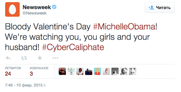 Хакеры взломали микроблог журнала Newsweek, на который подписано более 2,5 млн человек. Они заменили аватар и фоновое изображение профиля, разместив на них голову человека в мусульманском платке, а также надписи «Cybercaliphate» («Киберхалифат») и «Je suIS IS» (образовано от лозунга «Je suis Charlie» и аббревиатуры ISIS).