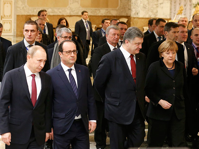 Во Дворце независимости в Минске в четверг завершились напряженные и рекордные по длительности переговоры "нормандской четверки" по урегулированию украинского кризиса. Президенты РФ Владимир Путин, Франции Франсуа Олланд, Украины Петр Порошенко и канцлер ФРГ Ангела Меркель обсуждали пути решения конфликта на Донбассе всю ночь без отдыха и сна, прервавшись лишь дважды - на церемонию фотографирования и на ужин. Утром пресса сообщила, что встреча лидеров завершилась спустя почти 14 часов после начала, но буквально через полчаса стало известно о продолжении переговоров.