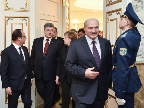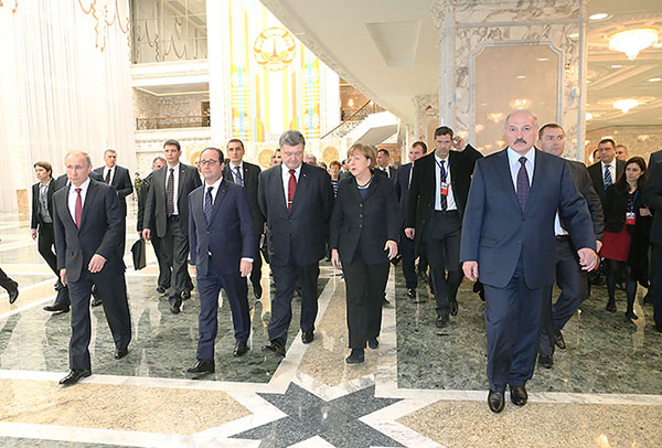 Переговоры «Нормандской четверки» в Минске Комментарий редактора: Представители ДНР и ЛНР поначалу отказались подписывать согласованный текст соглашения. После этого переговоры «нормандской четверки» продолжились, а президент России Владимир Путин, по словам Ангелы Меркель и Франсуа Олланда, надавил на сепаратистов, в результате чего мирные договоренности были ими подписаны.