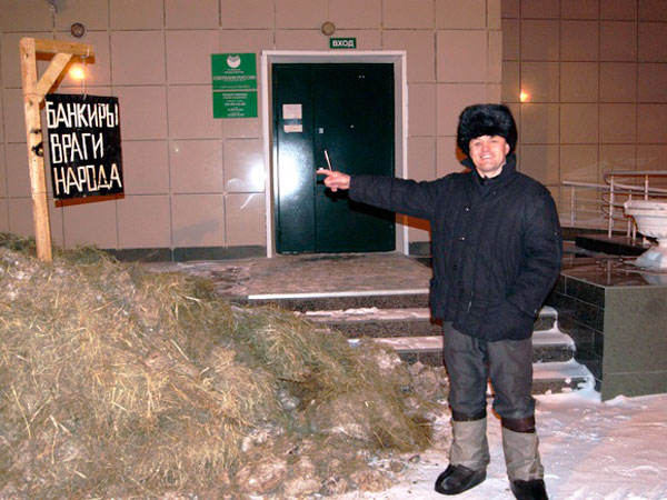 В городе Куйбышеве Новосибирской области фермер Александр Бакшаев высыпал телегу навоза перед отделением Сбербанка в знак протеста против политики кредитных организаций, сообщает «Интерфакс». Протестующий также поставил плакаты с надписями «Банкиры — враги народа» и «Долой кредитное рабство» возле дверей банка, после чего более часа раздавал интервью.