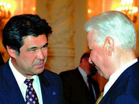 Аман Тулеев и Борис Ельцин Но в августе 1996 года Тулеев все-таки переезжает в Москву: Борис Ельцин после выборов пытается собрать вокруг себя широкую коалицию, и политик из Кузбасса получает пост министра по делам СНГ. Фактически он представляет в правительстве интересы Коммунистической партии: во время президентских выборов он выдвигал свою кандидатуру в качестве запасного варианта на случай недопущения Геннадия Зюганова до выборов, а с августа он стал одним из трех сопредседателей Народно-патриотического союза России, организации, которая объединяла КПРФ и близкие ей политические структуры.