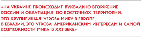 «На Украине происходит буквально вторжение России и оккупация ею восточных территорий. Это крупнейшая угроза миру в Европе, в Евразии, это угроза американским интересам и самой возможности мира в XXI веке», — подчеркнул один из авторов доклада Строуб Тэлботт, представляя доклад в «Атлантическом совете США» (Atlantic Council).