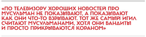 «Им всю жизнь вдалбливали, что ислам — это терроризм» Если у собеседников NT в Мещанском районе есть страх перед мусульманами и исламом, то в последние годы для этого было немало печальных поводов: бесконечные войны на Ближнем Востоке, зверства «Исламского государства», теракт в «Шарли Эбдо».