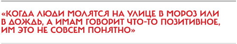 «Когда люди молятся на улице в мороз или в дождь, а имам говорит что-то позитивное, им это не совсем понятно, — говорит Ренат Абянов, заместитель руководителя аппарата Совета муфтиев России и преподаватель истории в Исламском колледже. — Вы когда-нибудь молились в луже? Тогда вы меня не поймете!» NT писал о проблеме нехватки мечетей в Москве в №31 (299), 30 сентября 2013 года.