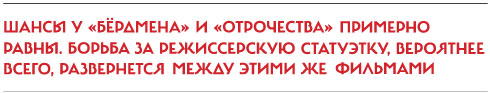 Шансы у «Бёрдмена» и «Отрочества» примерно равны. Борьба за режиссерскую статуэтку, вероятнее всего, развернется между этими же фильмами. Возможно, одному из них достанется главная награда, а создатели другого получат более «легкую» статуэтку — за режиссуру. Не исключено, впрочем, что обе главные награды, как это часто и бывает, возьмет один фильм.