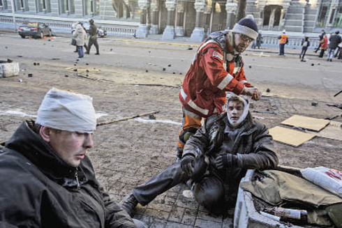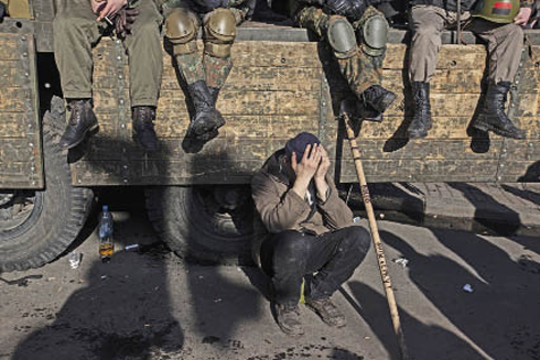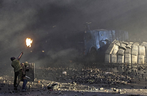 Сторонник Майдана в перерыве между стычками с милицией у Мариинского парка, Киев, 18 февраля 2014 годаАлександр Турчинов: Когда началась бойня, я вышел из парламента — было понятно, что там делать нечего — нужно было проанализировать ситуацию, оценить расстановку сил. Мне позвонил Арсений Яценюк — попросил вернуться в парламент. Опять все собрались в кабинете (спикера) Рыбака. /…/ Уже прошла информация о первых жертвах, все понимали, что этим, увы, не ограничится, и меня начали убеждать встретиться с Януковичем. /…/ Говорили, я должен договориться об окончании противостояния; так, чтобы силовики прекратили стрелять, а мы отошли бы обратно на Майдан. По предварительной информации, уже около 20 человек погибло, огромное количество тяжелораненых. Я дал согласие на встречу. Новинский (один из руководителей фракции Партии регионов. — NT) связался с администрацией (президента) и сказал, что нас ждут. /…/