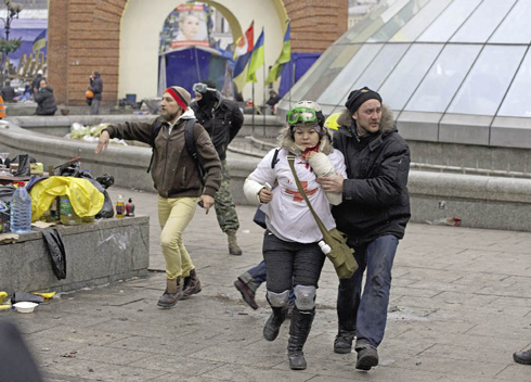 Олеся Жуковская (слева) после ранения в шею написала в твиттере «я вмираю». После операции она осталась жива, Киев, 20 февраля 2014 года Кульминация противостояния на Майдане. Виктор Янукович начинает терять верных соратников: в 11.00 о выходе из Партии регионов объявляет глава киевской горадминистрации Владимир Макеенко. От власти в Киеве отворачиваются целые подразделения силовиков в регионах. Минздрав Украины публикует официальные данные: за последние три дня в Киеве погибло 64 человека. В 15.20 Верховная Рада неожиданно принимает постановление о запрете на использование силовиками оружия и спецсредств, о возвращении всех силовых подразделений к местам постоянной дислокации и прекращении антитеррористической операции, объявленной ранее руководством СБУ. Причем, по данным бывших членов фракции Партии регионов, за этот документ их уговаривал проголосовать лично глава президентской администрации Андрей Клюев, из-за чего между ним и Януковичем возник конфликт — президент расценил такое поведение главы АП как предательство.