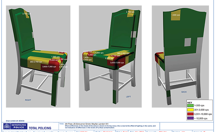 Детективы побывали в номерах отеля, где останавливались предполагаемые убийцы, в баре Pine, в конференц-зале компании Erinys. Они обнаружили «Мерседес», на котором ездил Луговой. И везде были следы полония. Эта часть расследования получила название «операция Avocet» (шилоклювка, морская птица, которую можно видеть на мелководье, где она в поисках корма роет клювом ил или песок — МЗ). Эксперты-криминалисты получили целый ряд показателей уровня альфа-излучения. Затем специалисты бюро компьютерного моделирования городской полиции потрясающе воссоздали место преступления в 3D. На изображении уровни радиации были обозначены разными цветами: зеленым, желтым, красным и фиолетовым. Последний означал самый высокий уровень излучения – больше 10 000 импульсов (счетчика Гейгера – МЗ) в секунду и выше. Именно в этот цвет окрашен носик чайника Литвиненко. Такое же пятно находится в центре чайника.